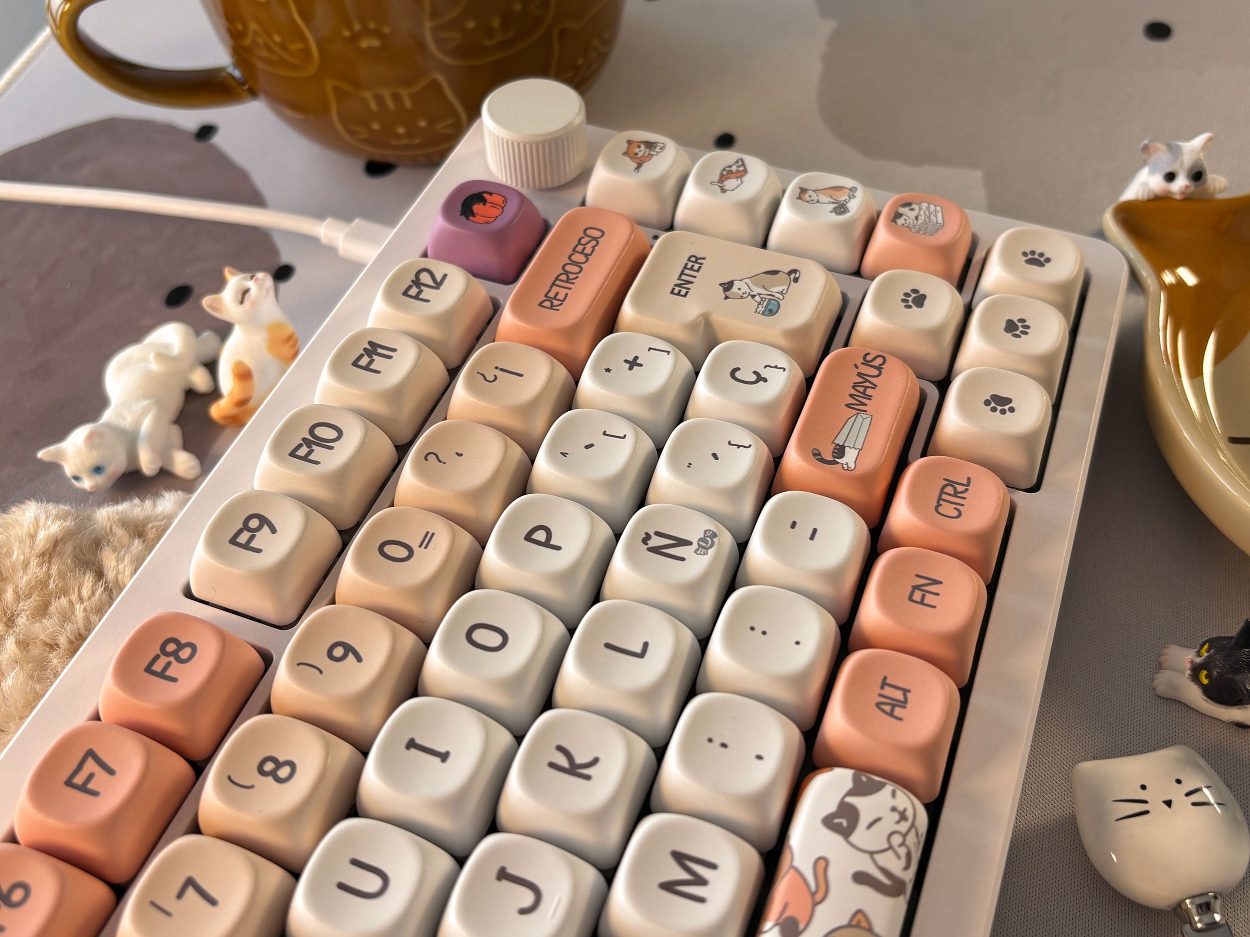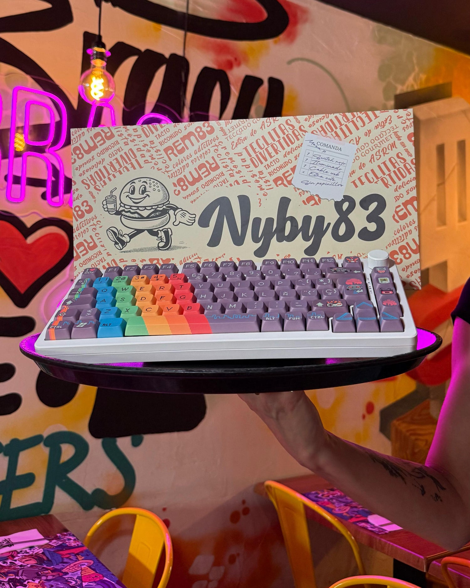 El Nyby83 viene cargadito de capas irresistibles: switches crujientes, keycaps sabrosas y una base firme que aguanta cualquier antojo. Un teclado en formato 75% con ruleta de control, listo para servirse en tu escritorio.