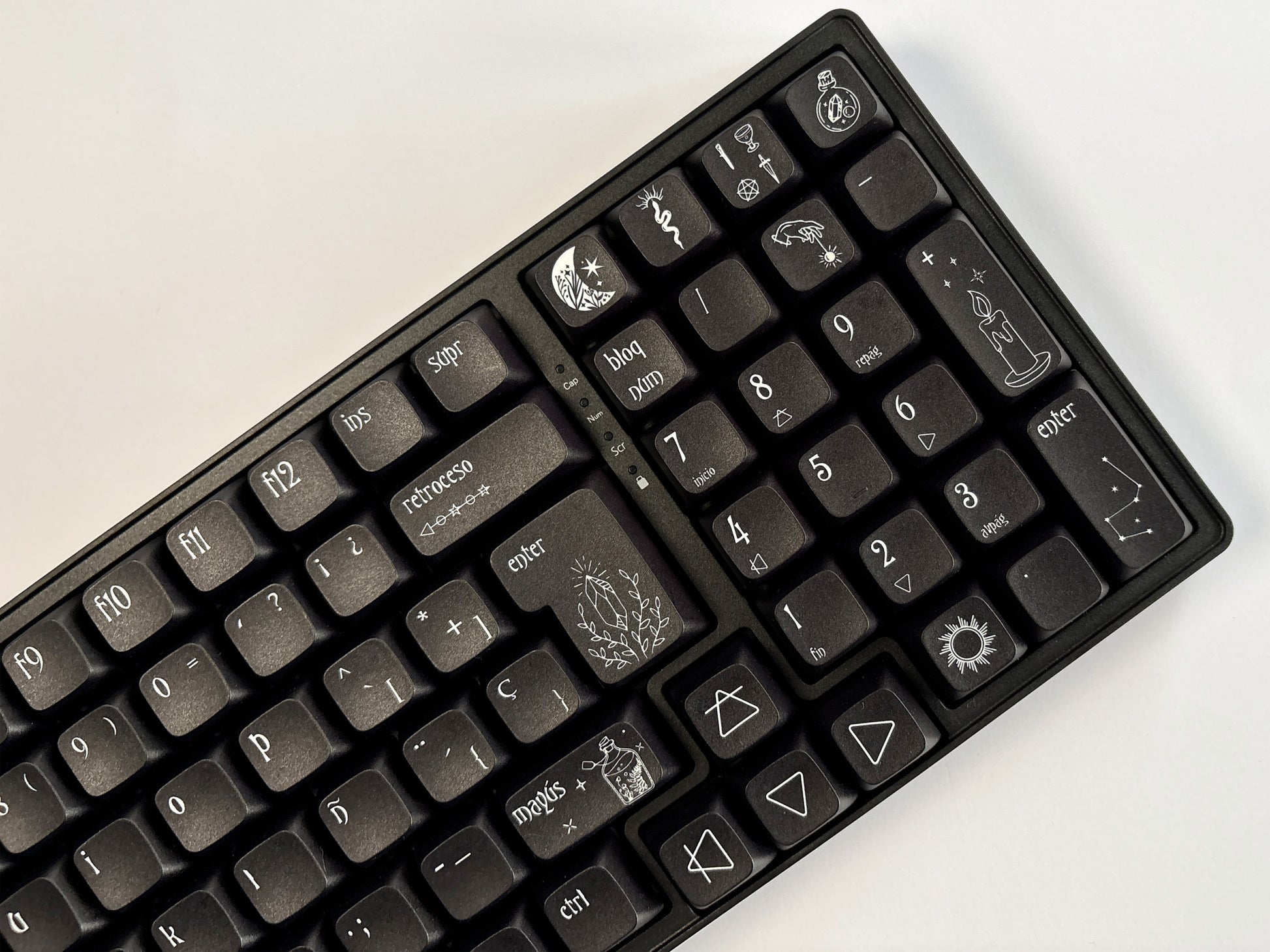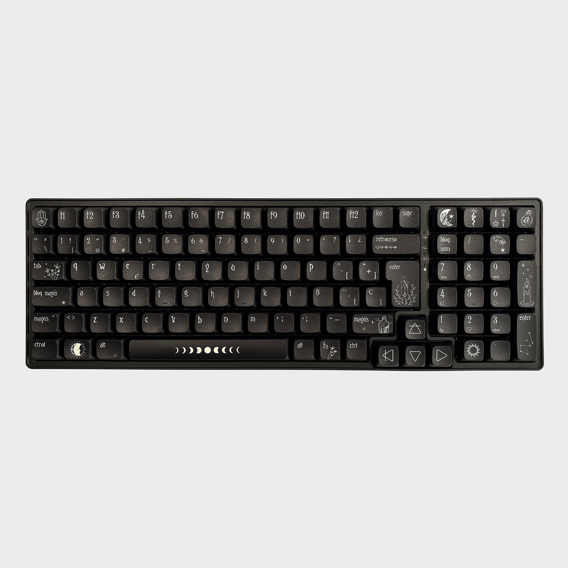 Un teclado mecánico que mezcla fases lunares, signos y formas ancestrales para acompañarte mientras escribes, diseñas o juegas.